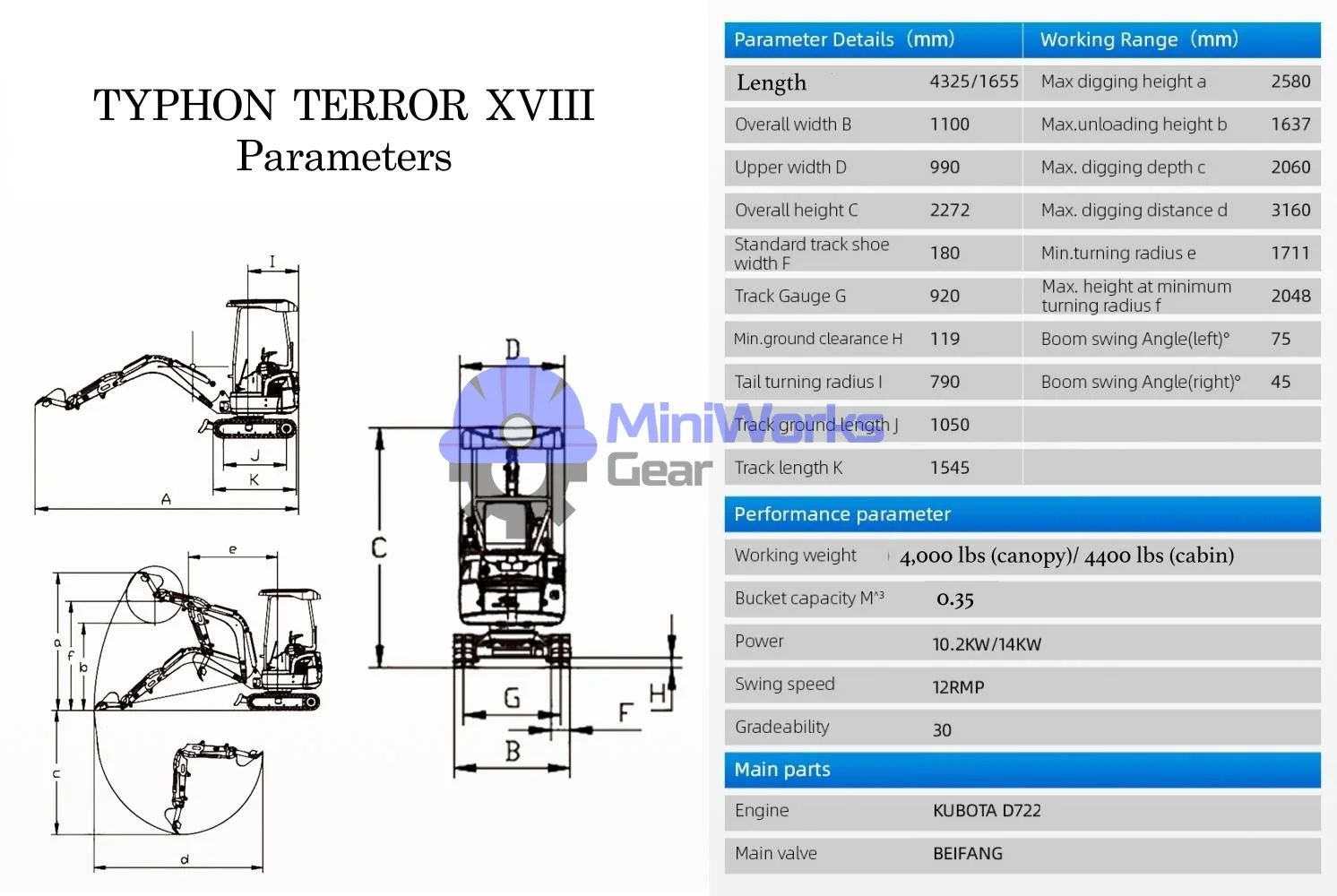 - Optimized Operating Weight: At approximately 1814 kg, the Typhon Terror XVIII offers a perfect balance of stability and agility, enhancing digging performance and operator comfort.