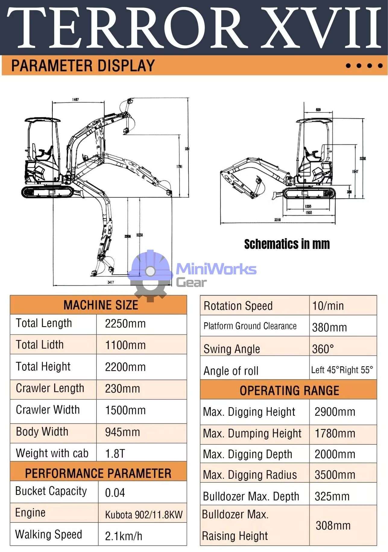 Unleash unparalleled power and precision on your job site with the 2025 TYPHON TERROR XVII Cabin Mini Excavator from MiniWorksGear. Engineered for superior performance and operator comfort, this robust 1814 kg (4000 lb) machine is powered by the legendary Kubota D902 Diesel Engine, ensuring reliable, fuel-efficient operation. Its enclosed cabin provides a safe and comfortable working environment, while the durable rubber tracks offer excellent maneuverability and minimal ground disturbance, making it the ideal choice for a wide range of demanding tasks.